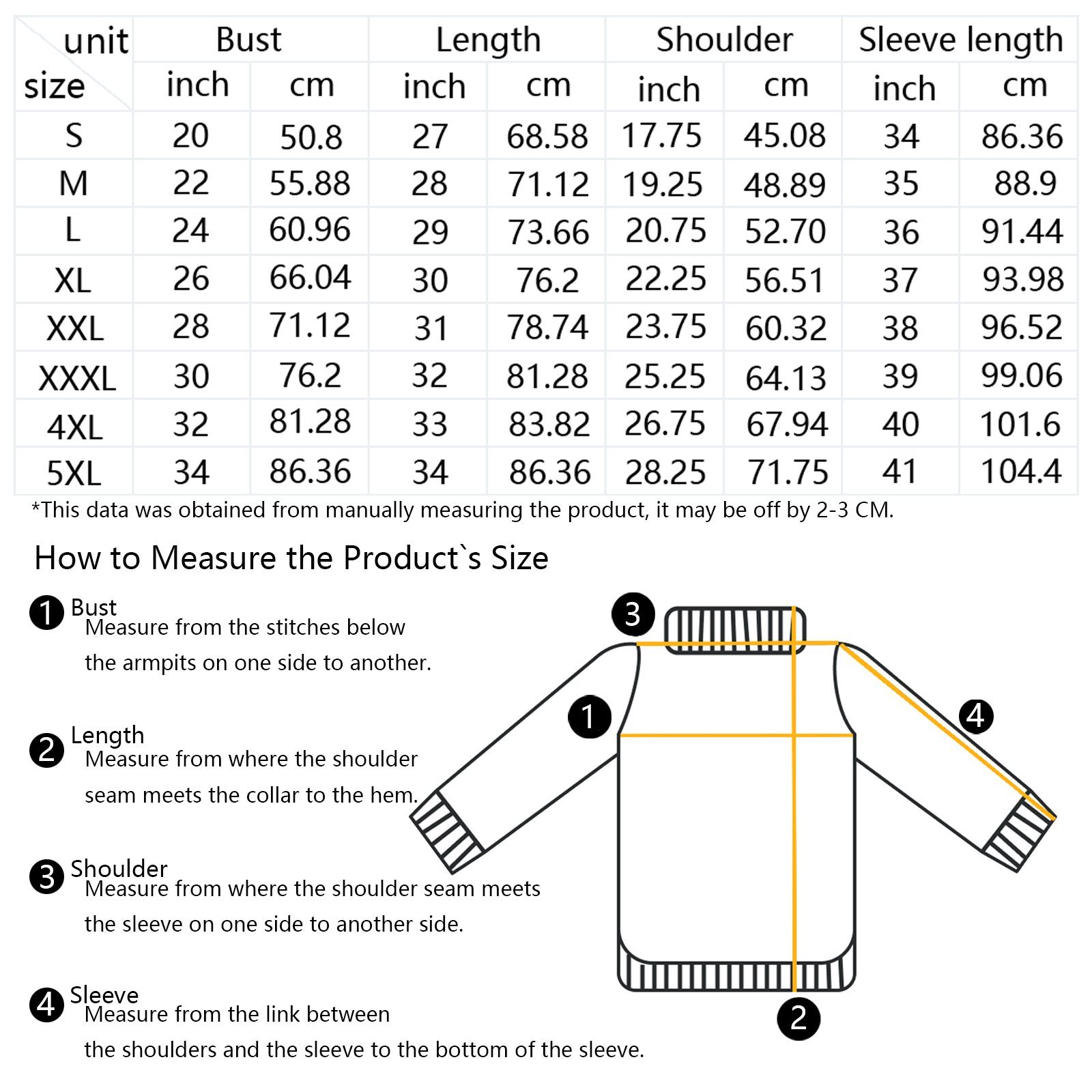 The measurement data of this size is obtained by laying clothes flat. Due to different measurement methods, it is normal that the error is within 2-3cm.